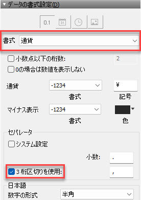 「データの書式設定」で、書式を「通貨」にし、「3桁区切りを使用」のチェックボックスをオンにします。