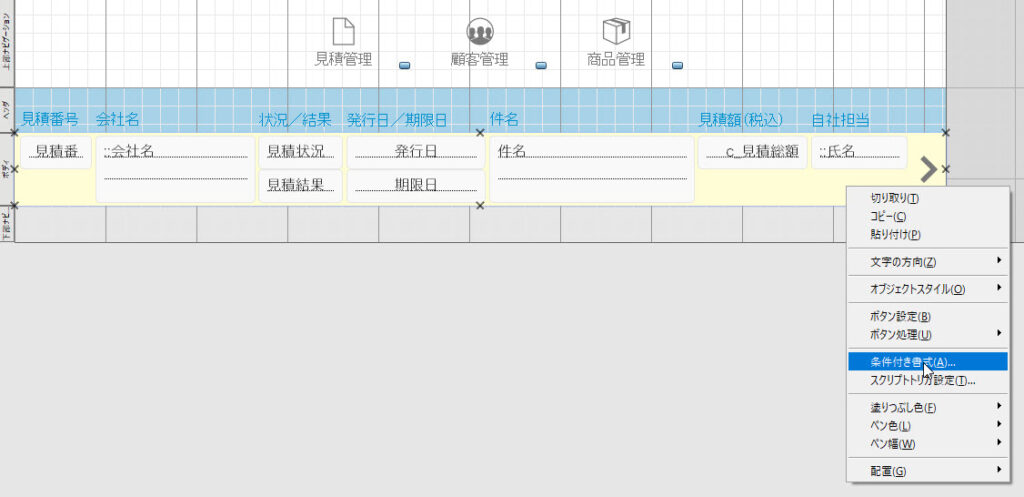 ボタンを右クリックし、「条件付き書式」で条件を付けます。(下の画像では、開発者がわかりやすいようにボタンの色を薄い黄色にしてあります。)